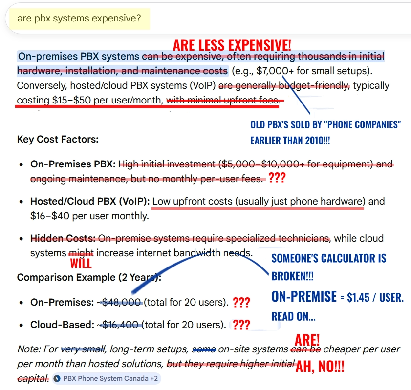 PBXSystem.ca has been dedicated to on-premise and in-house solutions since 2005. We had transitioned to selling lower-cost IP-PBX based telephony solutions even before they were "the norm". When you compare OLDER analog PBX systems sold by big telephone companies before 2010, and even some other larger phone system companies that still exist today - the systems we sell are far less costly when you focus on the right information.