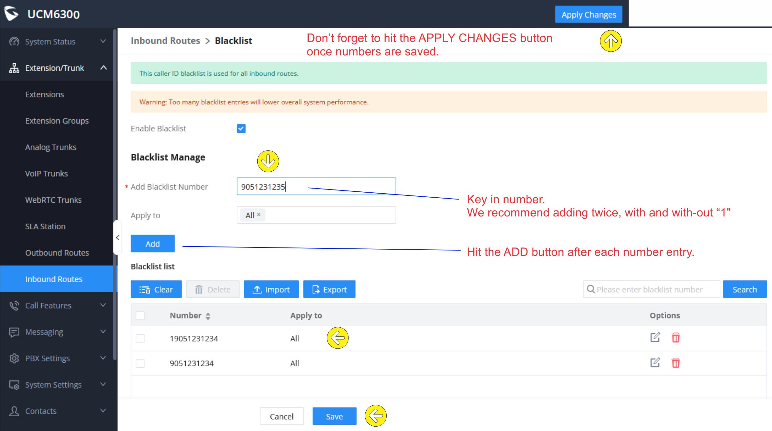 Enter in the phone number in the "Add Blacklist Number" field. Click the ADD button to add each one separately. We recommend entering in both the 10 digit number (area code + prefix + number) & add the same number with "1" leading digit (see image example below).