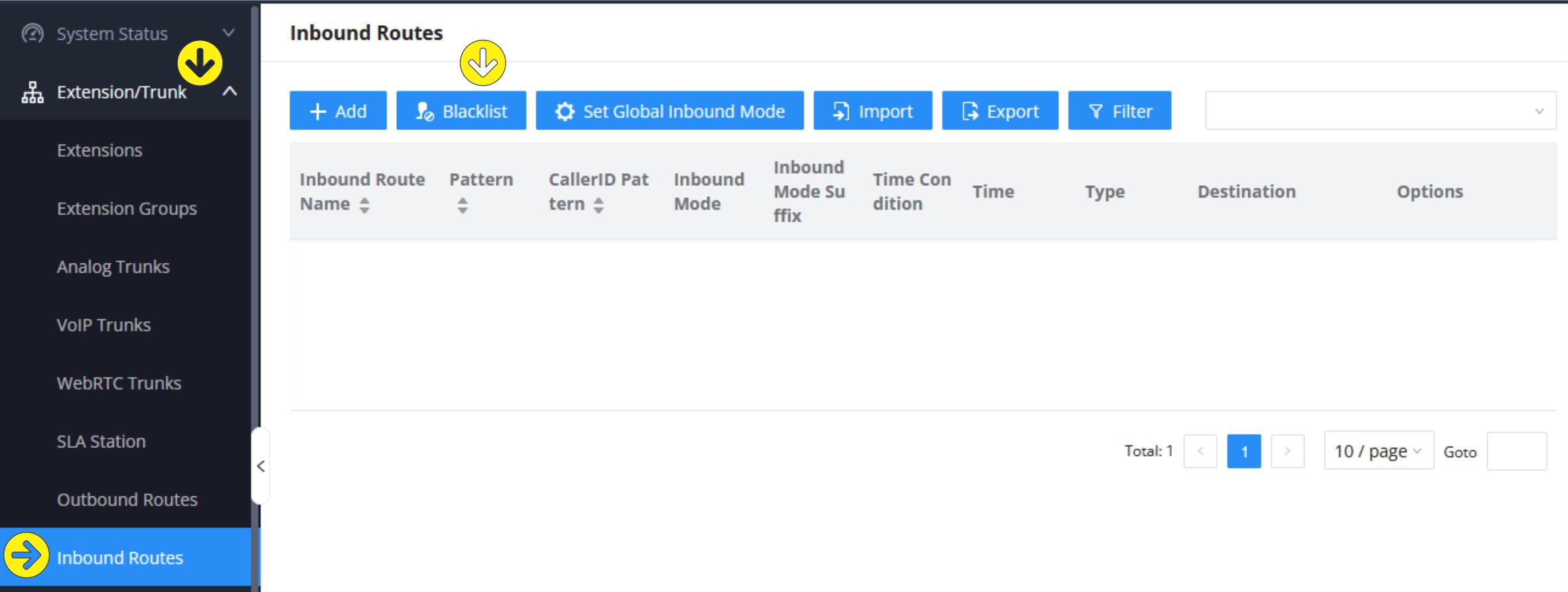 Once on the Extensions/Trunks / Inbound Routes page in the main system, select the