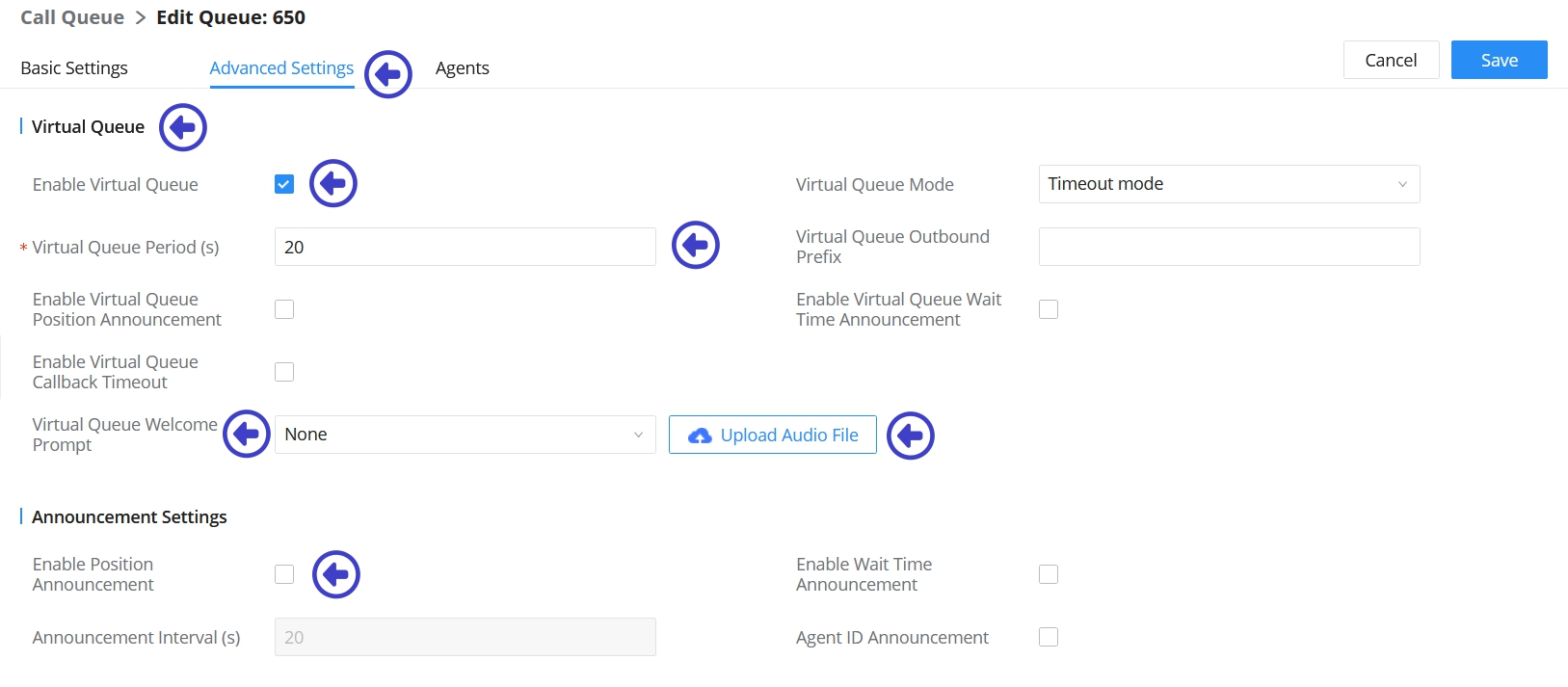 First item to consider when using Virtual Queue is to enable the Announcement Settings / Enable Position Announcement.
